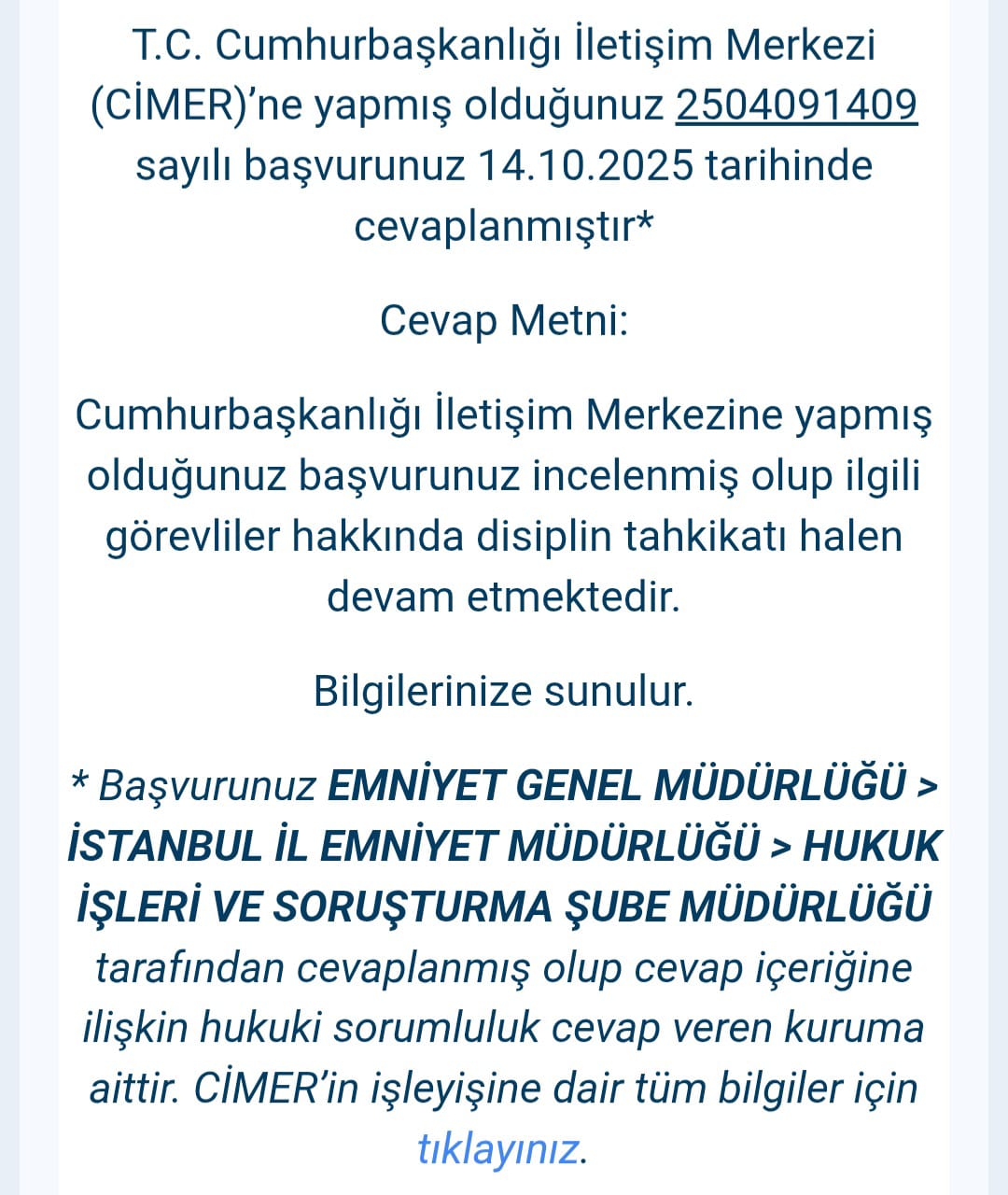 " İSTANBUL EMNİYET MÜDÜRLÜĞÜ, ŞİKAYETİN AKIBETİ HAKKINDA BİLGİ VERDİ "Müfettişin CİMER aracılığıyla Emniyet Genel Müdürlüğüne ilettiği şikayetine İstanbul İl Emniyet Müdürlüğü tarafından iletilen 14.10.2025 tarihli cevabi yazıda şu ifadeler yer aldı :