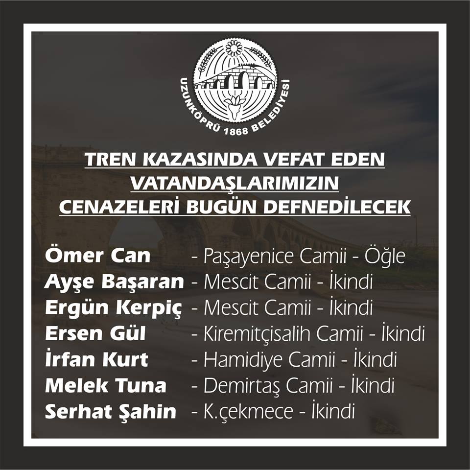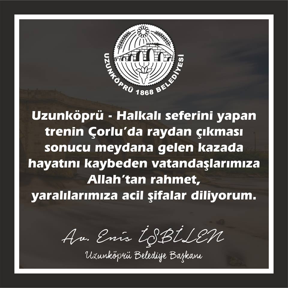 UZUNKÖPRÜ BELEDİYE BAŞKANI ENİS İŞBİLEN’DEN AÇIKLAMA Uzunköprü Belediye Başkanı Enis İşbilen, isimlerin Uzunköprü Belediyesi görevlileri tarafından Tekirdağ, Çorlu ve Muratlı Belediyelerine ulaşan ölüm haberleri ile sağlandığını söyledi. İşbilen, Uzunköprü Belediyesi ekiplerinin kazanın ardından bu yana bölgede çalışmalarını sürdürdüğünü ekledi.