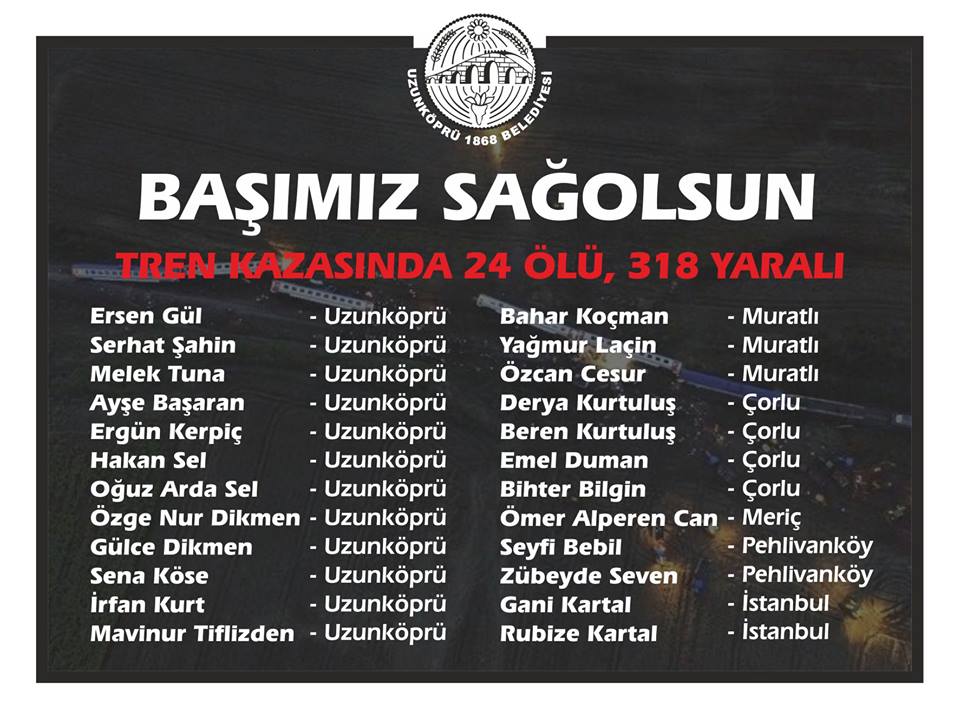 ÇORLU 'DAKİ TREN KAZASINDA HAYATINI KAYBEDEN 24 KİŞİNİN İSMİ:Ersen Gül, Serhat Şahin, Melek Tuna, Ayşe Başaran, Ergün Kerpiç, Hakan Sel, Oğuz Arda Sel, Özge Nur Dikmen, Gülce Dikmen, Sena Köse, İrfan Kurt, Mavinur Tiflizden, Bahar Koçman, Yağmur Laçin, Özcan Cesur, Derya Kurtuluş, Beren Kurtuluş, Emel Duman, Bihter Bilgin, Ömer Alperen Can, Seyfi Bebil, Zübeyde Seven, Gani Kartal, Rubize Kartal
