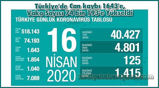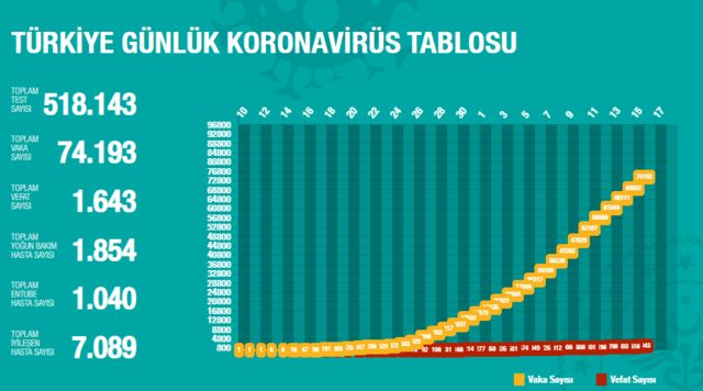 VAKA SAYISI 74 BİN 193'E YÜKSELDİTabloda bugüne kadar yapılan toplam test sayısı 518 bin 143, toplam vaka sayısı 74 bin 193, toplam yoğun bakım hasta sayısı 1854, toplam entübe hasta sayısı 1040, toplam iyileşen hasta sayısı ise 7 bin 89 olarak açıklandı.