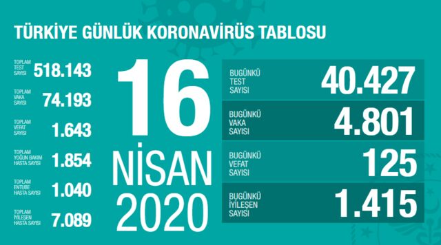 Sağlık Bakanı Fahrettin Koca, 'Türkiye Günlük Koronavirüs Tablosu'nu Twitter hesabından duyurdu.Sağlık Bakanlığı'nın internet sitesinden de paylaşılan tabloya göre; Son 24 saatte yapılan 40 bin 427 testten 4 bin 801'i pozitif çıktı.Bugün yaşamını yitiren 125 kişi ile birlikte koronavirüsten (Covid-19) toplam can kaybı 1643'e yükseldi. 1415 hasta da iyileşerek taburcu oldu.