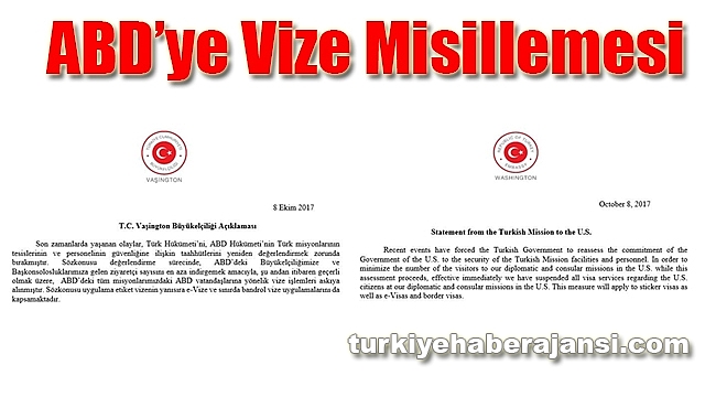 ABD’nin Türkiye'deki tüm ABD diplomatik misyonlarında göçmen olmayan vize hizmetlerini askıya aldığını açıklaması üzerine Türkiye’nin Washington Büyükelçiliği de "ABD’deki tüm misyonlarımızdaki ABD vatandaşlarına yönelik vize işlemleri askıya alınmıştır" açıklaması yaptı.ABD'nin Ankara Büyükelçiliği'nce yapılan yazılı açıklamada, "Son zamanlarda yaşanan olaylar, ABD hükümetini, Türkiye Cumhuriyeti hükümetinin ABD misyonunun tesisleri ve personelinin güvenliğine ilişkin taahhütlerini yeniden değerlendirmek zorunda bırakmıştır." ifadelerine yer verilmişti.