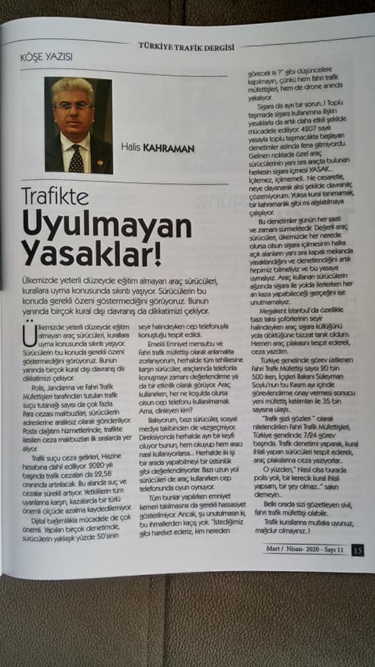 Ahmet Bahadır Alper'in İmtiyaz sahibi ve Sorumlu Yazı İşleri Müdürü, Abdullah Akdağ'ın Genel Yayın Müdürü ve Halis Kahraman'ın Haber Müdürü görevlerini üstlendikleri Trafik, Eğitim, Güvenlik ve Kültür içerikli konular yer alan Türkiye Trafik Dergisi'nin yeni sayısı okurlar tarafından beğenildi.