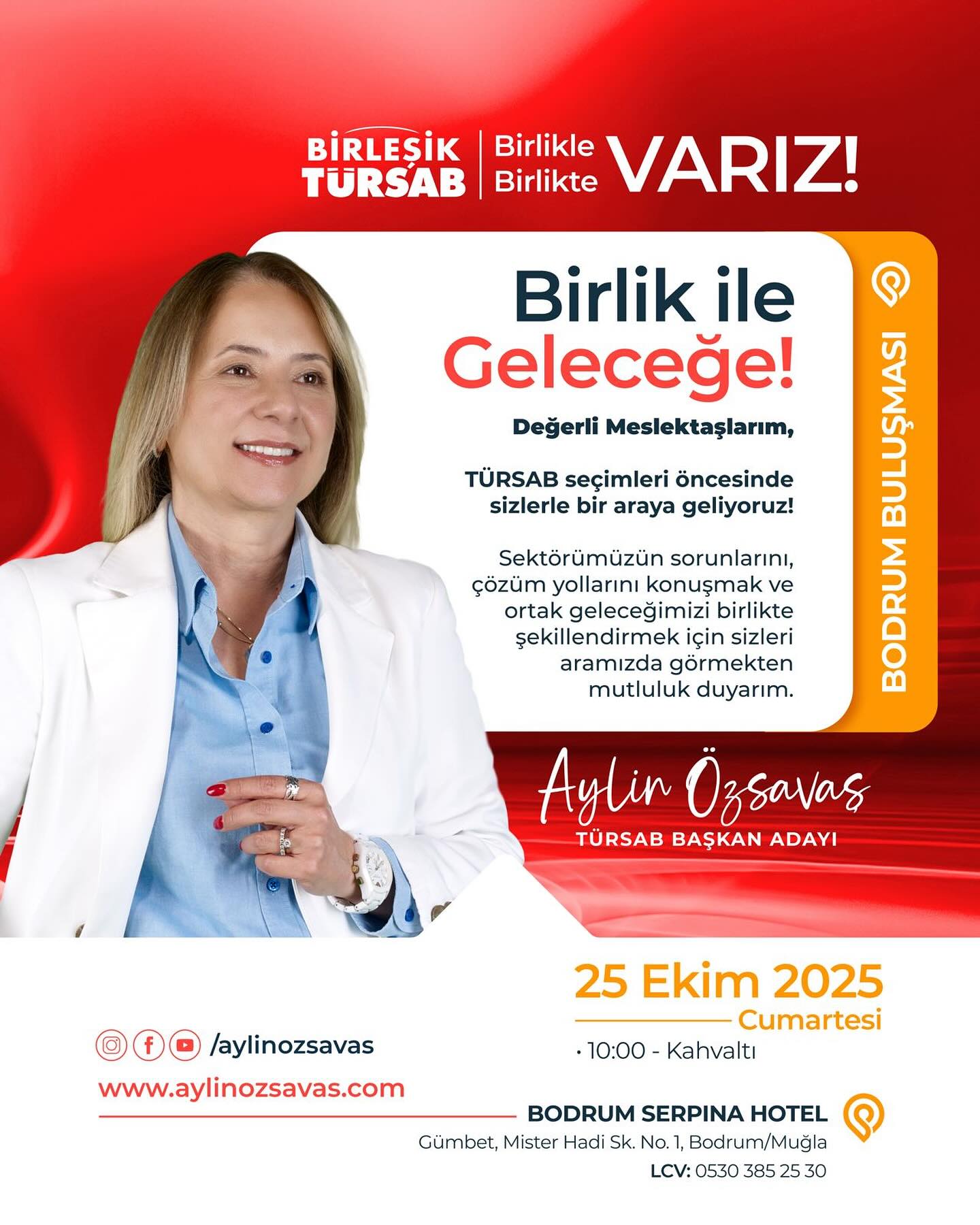 "Polis Eşi Aylin Özsavaş, TÜRSAB Başkan Adayı Oldu..! " İstanbul Emniyet Müdürlüğü kadrosunda bir dönem Çevik Kuvvet Şube Müdürü ve İl Emniyet Müdür Yardımcısı olarak görev yapmış olan Emekli 1'inci Sınıf Emniyet Müdürü Gökhan Özsavaş'ın eşi olan TÜRSAB Başkan adayı Aylin Özsavaş'ın sosyal medya hesabından Bodrum Buluşması hakkında yaptığı paylaşımda şu ifadeler yer aldı : "Birlik ile Geleceğe..!Değişim bitti, şimdi biz olma zamanı..!TÜRSAB seçimleri öncesinde sektörümüzün geleceğini birlikte şekillendirmek için bir araya geliyoruz.Sorunlarımızı, çözümlerimizi ve ortak hedeflerimizi konuşmak üzere siz değerli meslektaşlarımızı aramızda görmekten mutluluk duyarım.25 Ekim 2025, CumartesiSaat 10:00'da KahvaltıBodrum Serpina HotelLCV: (0530) 385 25 30Birlikte daha güçlü bir TÜRSAB için..!Aylin Özsavaş (TÜRSAB Başkan Adayı)www.aylinozsavas.com@aylinozsavas"