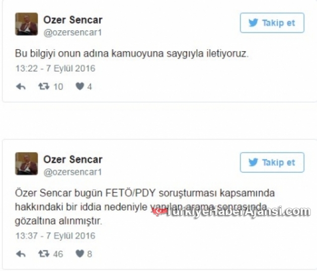 FETÖ soruşturması kapsamında, Metropoll Araştırma Şirketi'nin sahibi Özer Sencar gözaltına alındı.Özer Sencar'ın Twitter hesabından da şu bilgi paylaşıldı:''Bu bilgiyi onun adına kamuoyuna saygıyla iletiyoruz. Özer Sencar bugün FETÖ/PDY soruşturması kapsamında hakkındaki bir iddia nedeniyle yapılan arama sonrasında gözaltına alınmıştır.''
