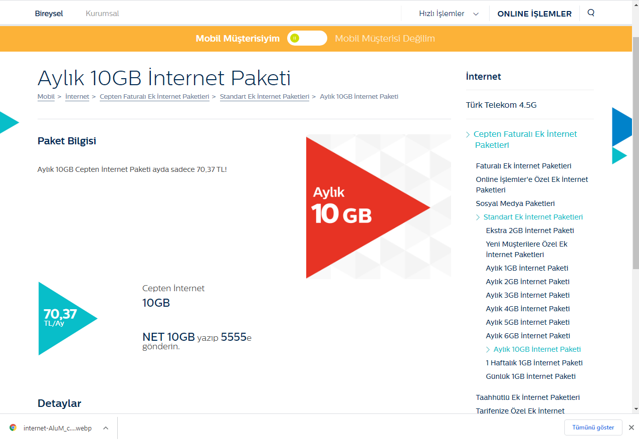 Düşünün Türk Telekom Aylık 10 GB İnternet için 70.37 TL / AY Fiyat sunmaya başladı.