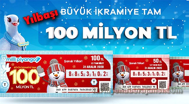 Bir Milli Piyango geleneği olan özel yılbaşı çekilişine geri sayım başladı. Yılbaşı özel çekilişinin büyük ikramiyesi 100 milyon lira olarak, Milli Piyango yılbaşı bilet fiyatları tam 100 TL, yarım 50 TL ve çeyrek bilet 25 TL olarak belirlendi.Yılbaşında dağıtılacak toplam ikramiye tutarı ise 563 milyon 400 bin TL olacak. 18 Kasım’dan itibaren oyunseverler, Milli Piyango biletlerini ister gezici bayiden, ister bayiden alabilecekler.TOPLAM İKRAMİYE TUTARI 563 MİLYON 400 BİN TL
