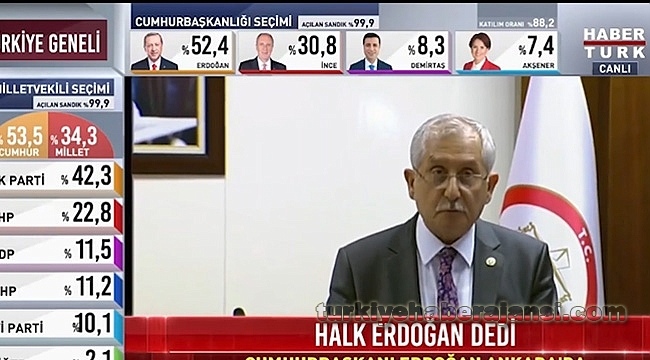 Sayın Recep Tayyip Erdoğan'ın, geçerli oyların salt çoğunluğunu aldığı anlaşılmıştır.